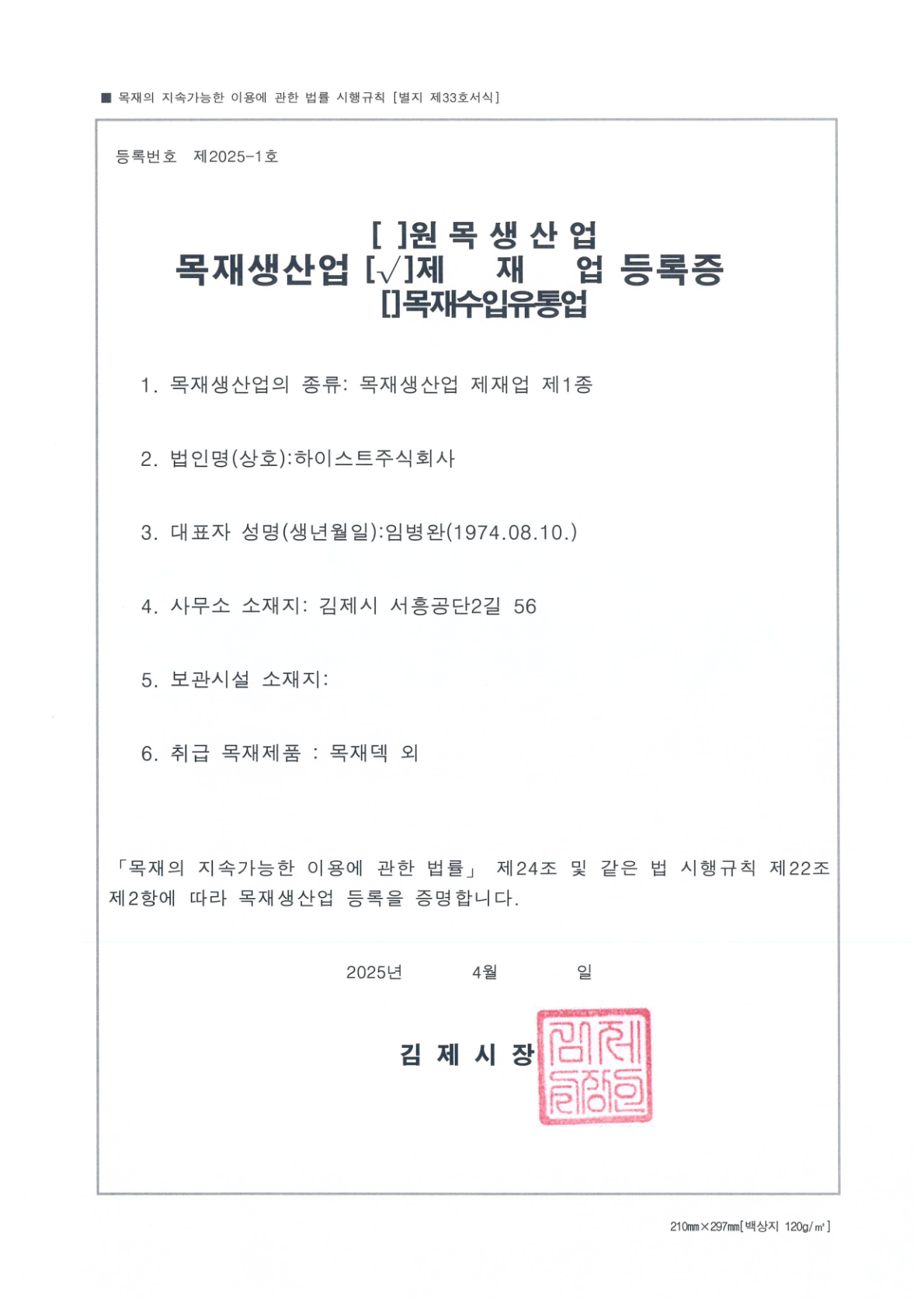 하이스트(주) 목재생산업 제재업 제1종 등록증